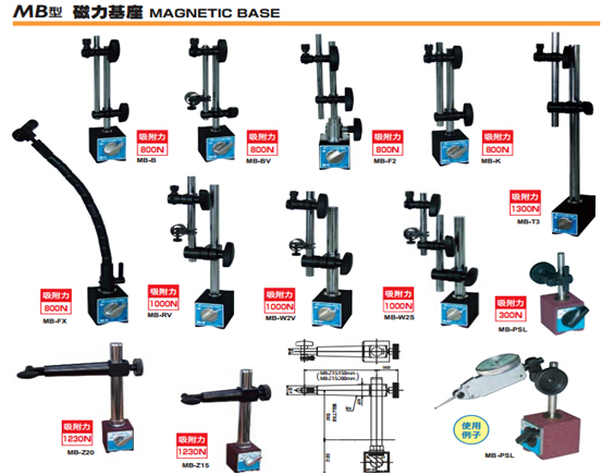 應(yīng)用:日本KANETEC強力公司專業(yè)生產(chǎn)的MB系列磁性基座機床或鐵平板上,主要對機械加工工件等的尺寸進行比較測量時,如果是以千分尺方式的測量器等進行測量(用以檢測誤差、偏差),本儀器作為測量器夾具得到廣泛使用。